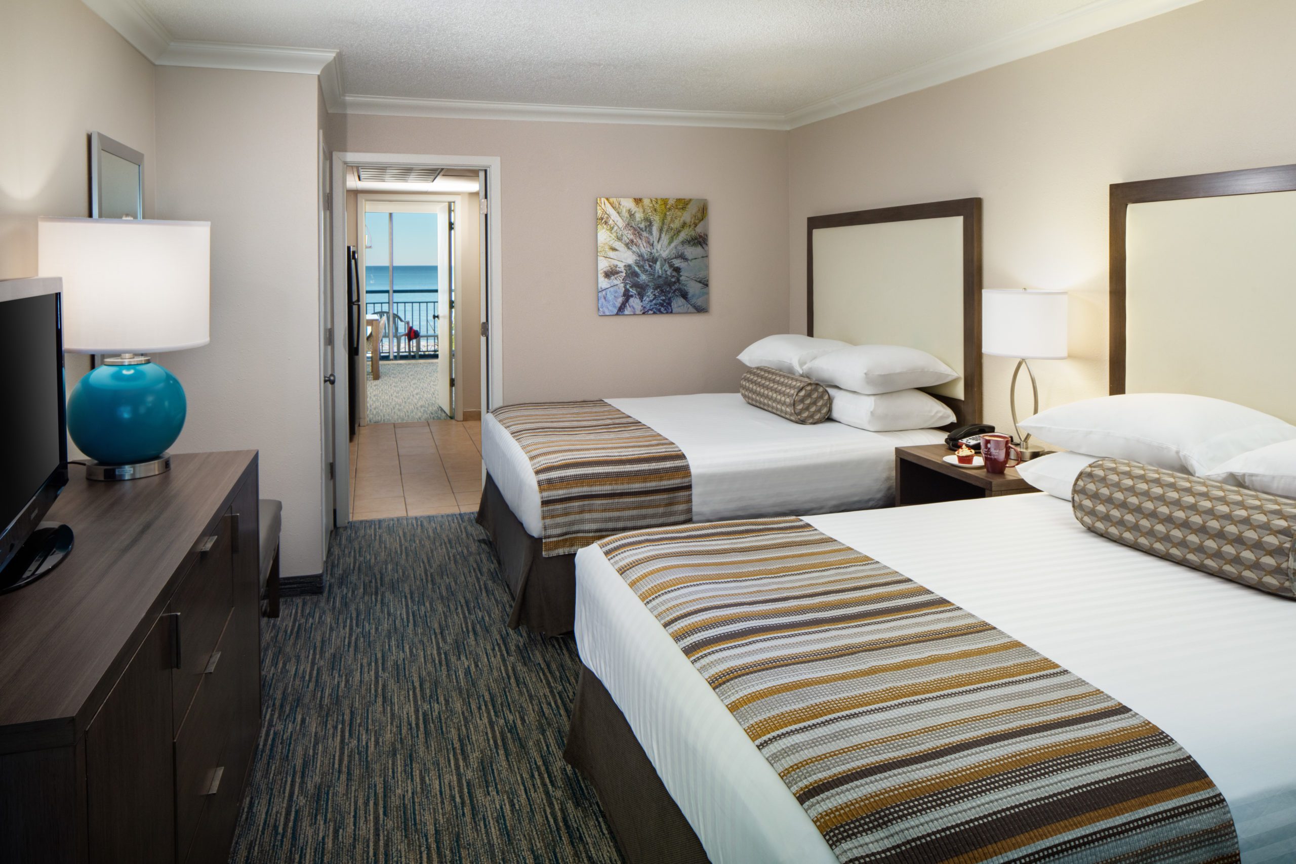 This ocean view room is ideal for couples or small families offering two queen sized beds, a small refrigerator, microwave & private balcony.