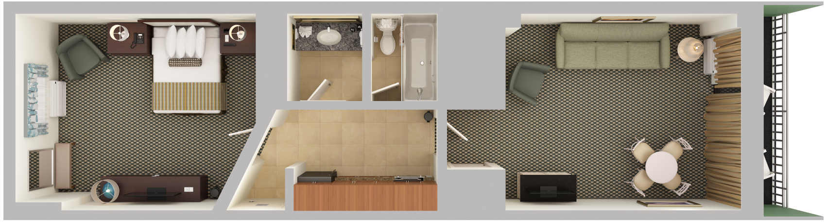 In addition to the king bed, the Premium Oceanfront One Bedroom King Suite features a side chair, table and chairs, sofa, wall bed and two balcony chairs.