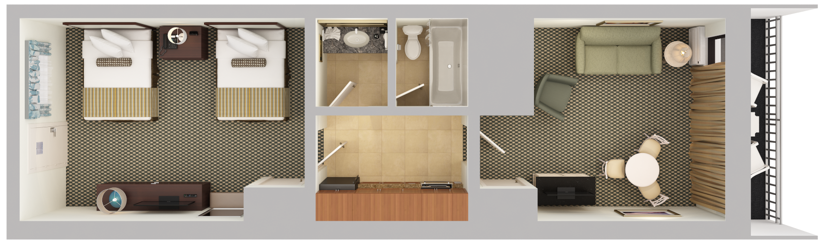 In addition to the two queen beds, the Oceanfront Family Suite features a side chair, table and chairs, sofa, wall bed and two balcony chairs.